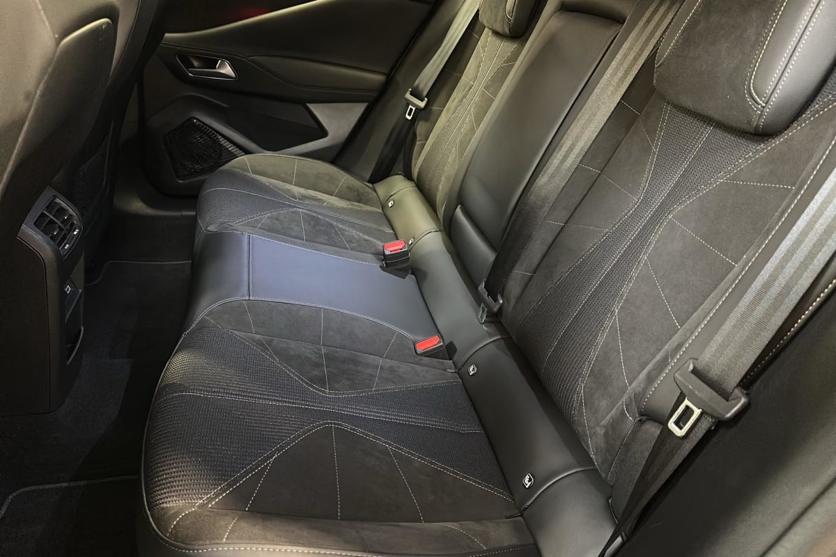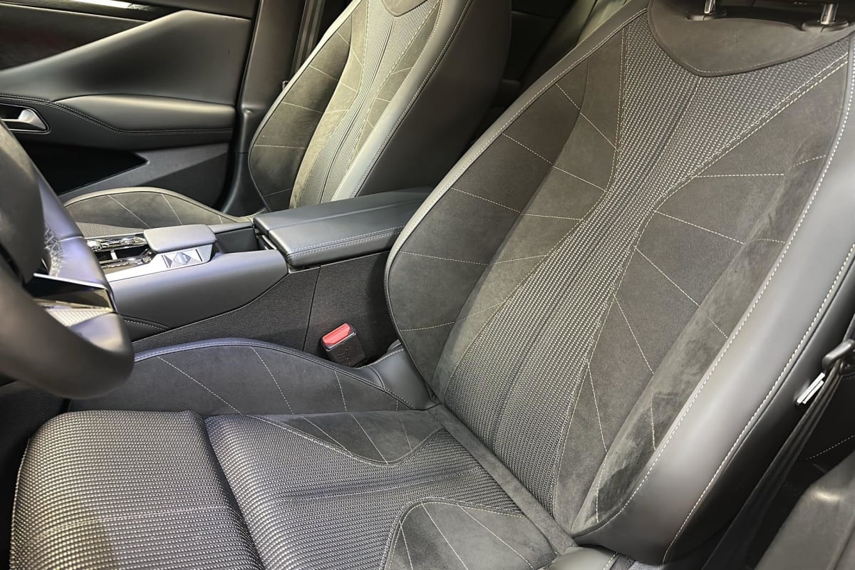 intérieur alcantara noir : planche de bord en alcantara ciel de pavillon clair sellerie en tissu tressé basalte avec alcantara et toile ds décors de panneaux de porte chrome guilloché volant cuir fleur mistral console en toile ds noir basalte panneaux de porte en alcantara et toile ds noir basalte