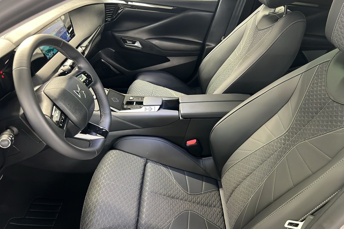 intérieur tissu diamond tungstène avec toile ds noir : ciel de pavillon clair sellerie en tissu diamond tungstène avec toile ds noir décors de panneaux de porte chrome guilloché console centrale en toile ds mistral planche de bord en toile ds noir basalte façon écaille volant cuir fleur mistral panneaux de porte en toile ds noir basalte façon écaille et toile ds noir basalte