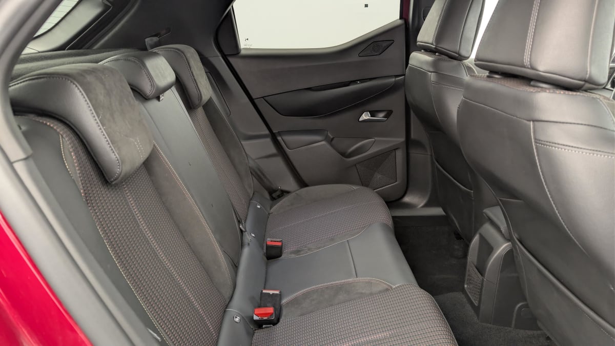 intérieur tissu tressé basalte avec alcantara : planche de bord alcantara noir ciel de pavillon gris galet volant cuir fleur perforé et coutures or et carmin décor alcantara noir siège tissu tressé basalte avec alcantara