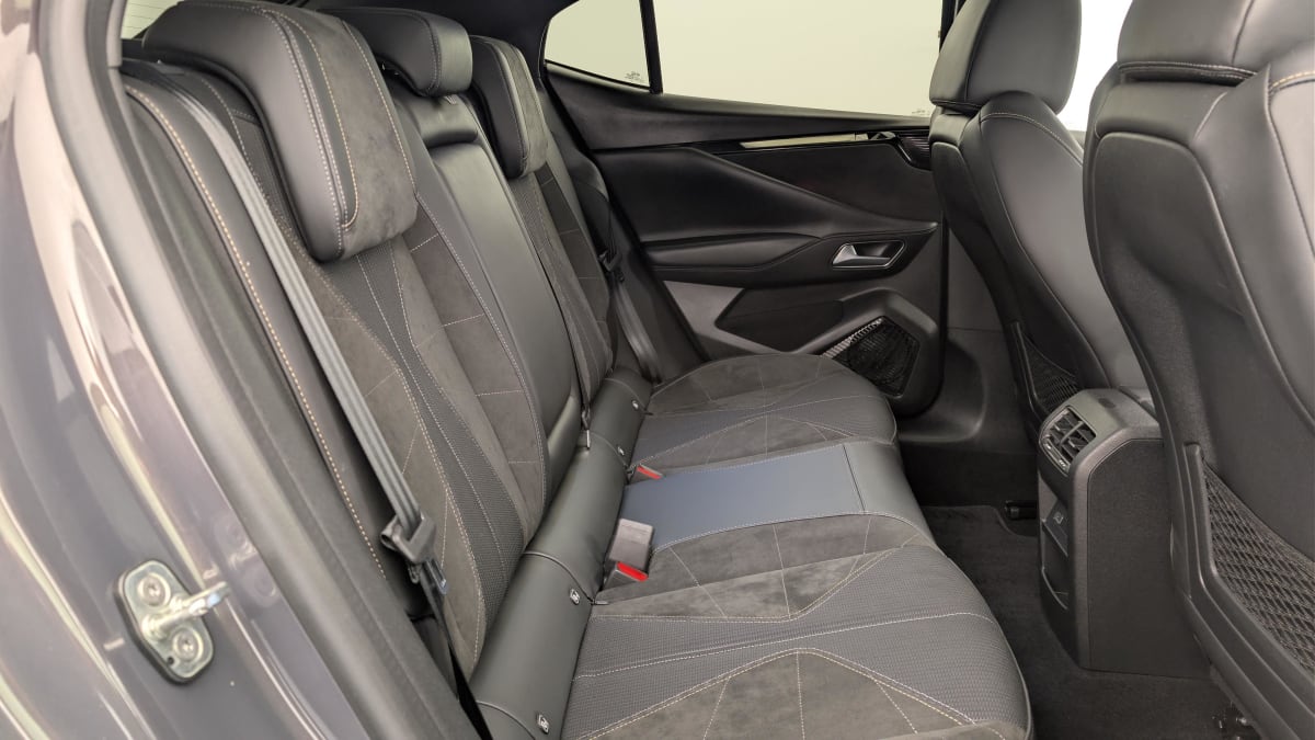 intérieur alcantara noir : planche de bord en alcantara ciel de pavillon clair sellerie en tissu tressé basalte avec alcantara et toile ds décors de panneaux de porte chrome guilloché volant cuir fleur mistral console en toile ds noir basalte panneaux de porte en alcantara et toile ds noir basalte