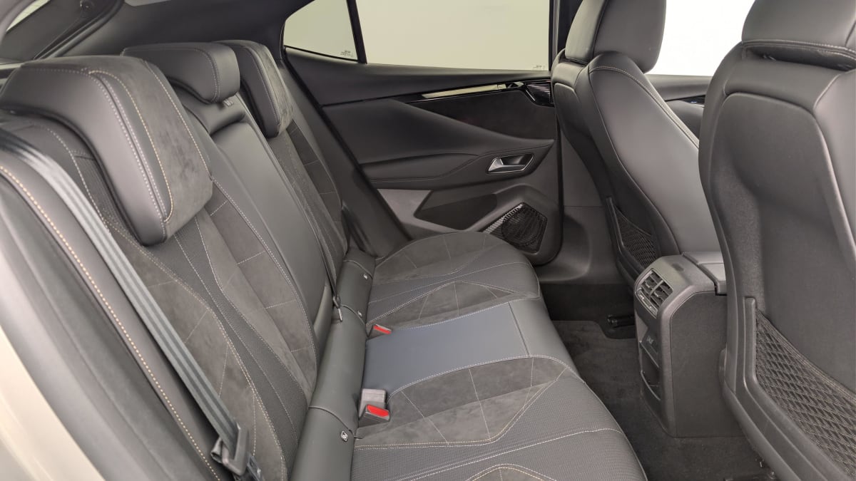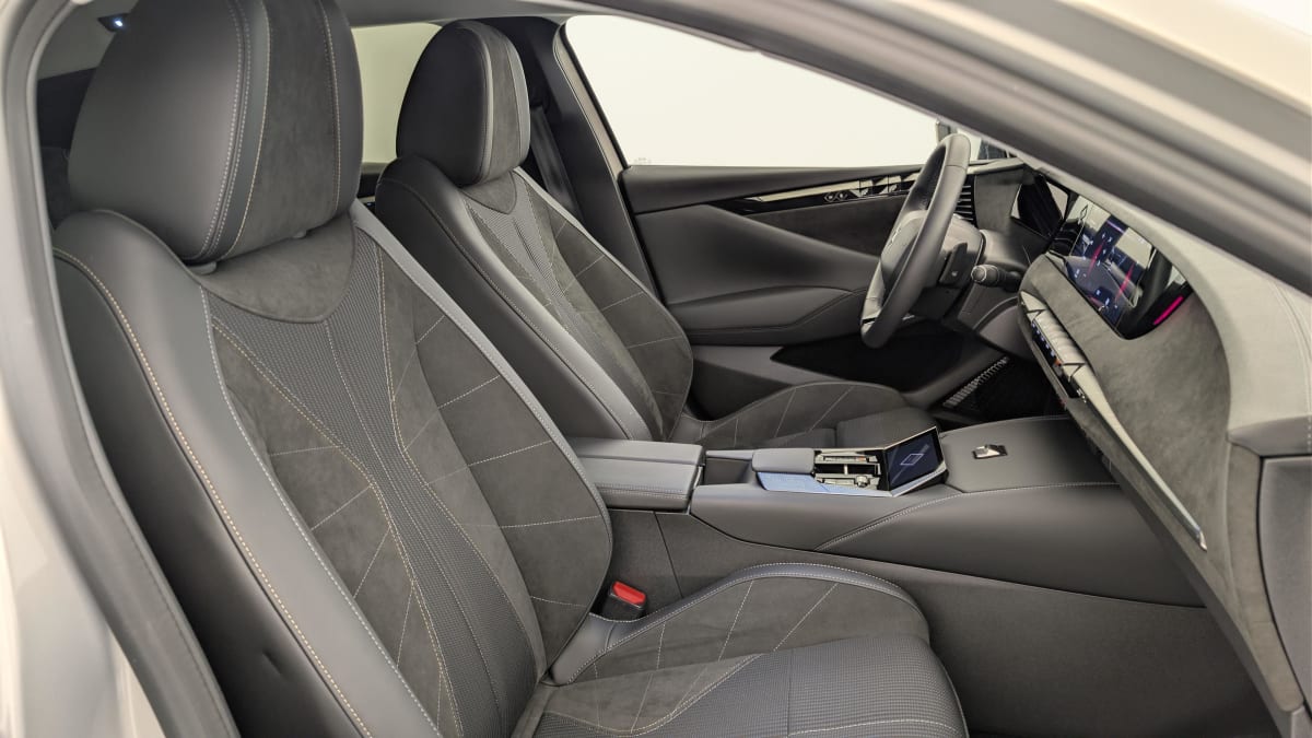 intérieur alcantara noir : planche de bord en alcantara ciel de pavillon clair sellerie en tissu tressé basalte avec alcantara et toile ds décors de panneaux de porte chrome guilloché volant cuir fleur mistral console en toile ds noir basalte panneaux de porte en alcantara et toile ds noir basalte