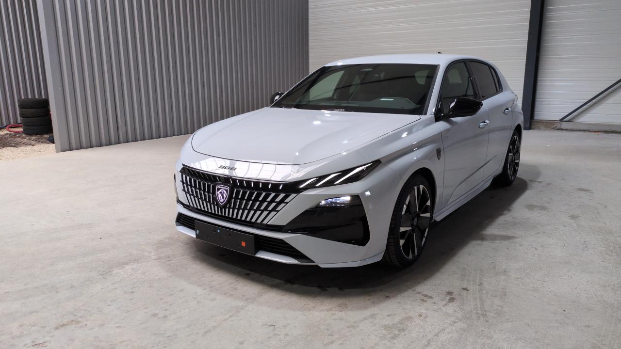 eléments de design extérieur calandre av avec grille supérieure et blason peugeot illuminés élargisseurs de pare-chocs av et de bas de caisse monogrammes blason peugeot sur ailes av lécheurs de vitre noir brillant
