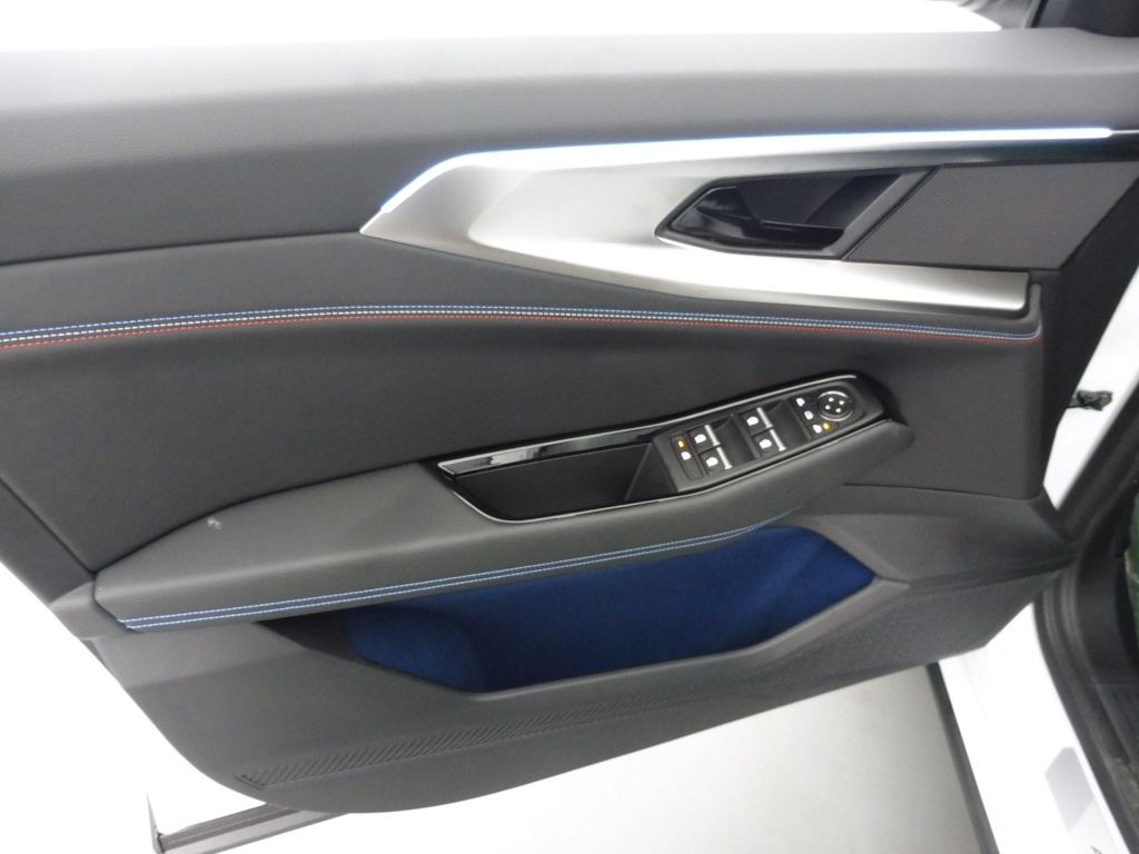sellerie mixte alcantara avec surpiqûres bleues et logo alpine lumineux